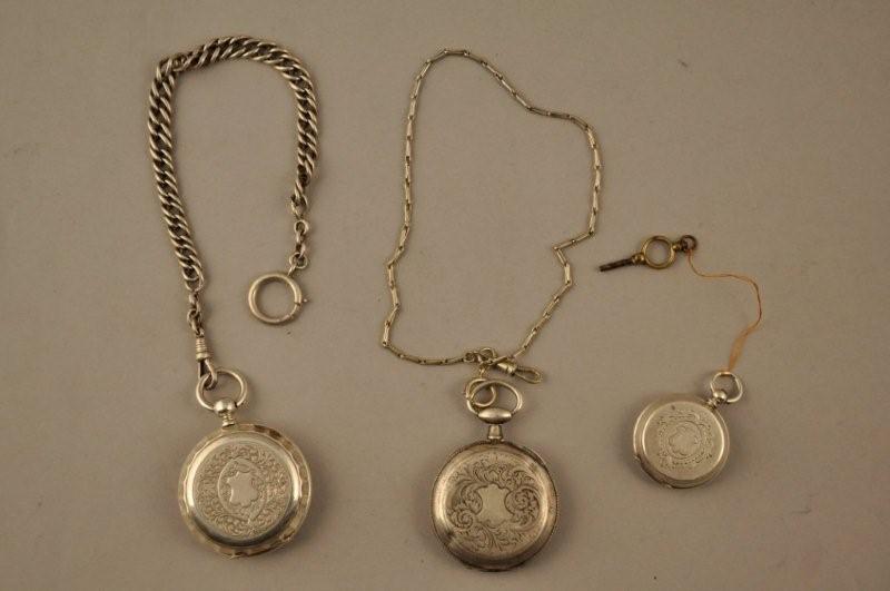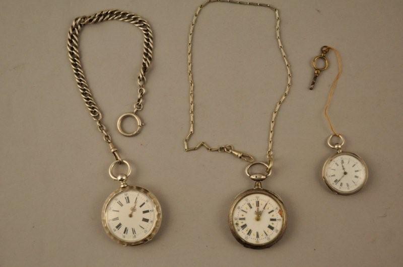 Trois MONTRES de GOUSSET en argent. La première à lunette côtelée, dos gravé d'arabesques autour d'un cartouche (non monogrammé), cadran en émail à chiffres romains pour les heures et chiffres arabes pour les minutes, mouvement gravé MOTILLON à La Roche Raimbault. (Poids brut : 73 g, manque une aiguille et petits accidents au cadran). La deuxième à dos guilloché et gravé d'un cartouche (non monogrammé), cadran en émail (Poids brut : 29,2 g). La troisième à dos gravé de volutes feuillagées autour d'un cartouche (Poids brut : 64 g, manque le verre, accidents au cadran, chocs)