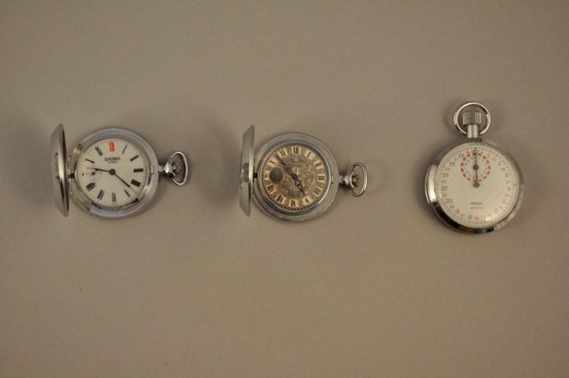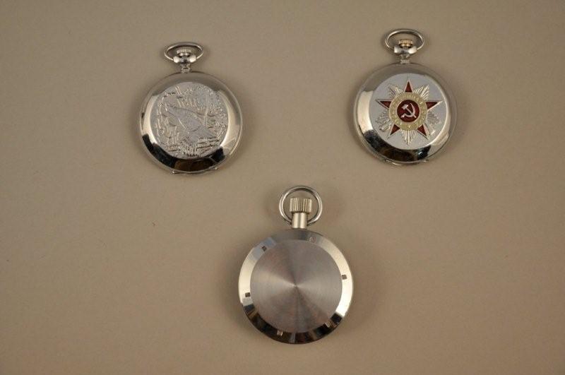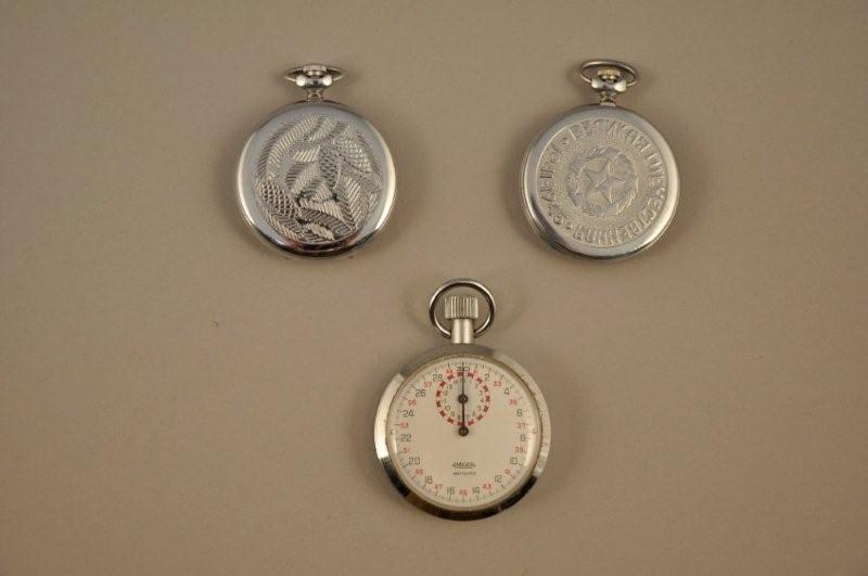 LOT comprenant : CHRONOMETRE JAEGER Antichoc. Deux MONTRES GOUSSET en métal, l'une SEKONDA à boitier à décor d'oiseau et pomme de pins, L'autre émaillée à emblèmes russes, datée 1941.