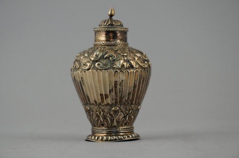 BOITE à THÉ en poire renversée en argent repoussé, sur léger piédouche à cotes torses. Décor de cotes droites, feuilles d'acanthe et motifs stylisés. Prise du couvercle en bouton pointu. Grande-Bretagne ? Poids : 80 g.