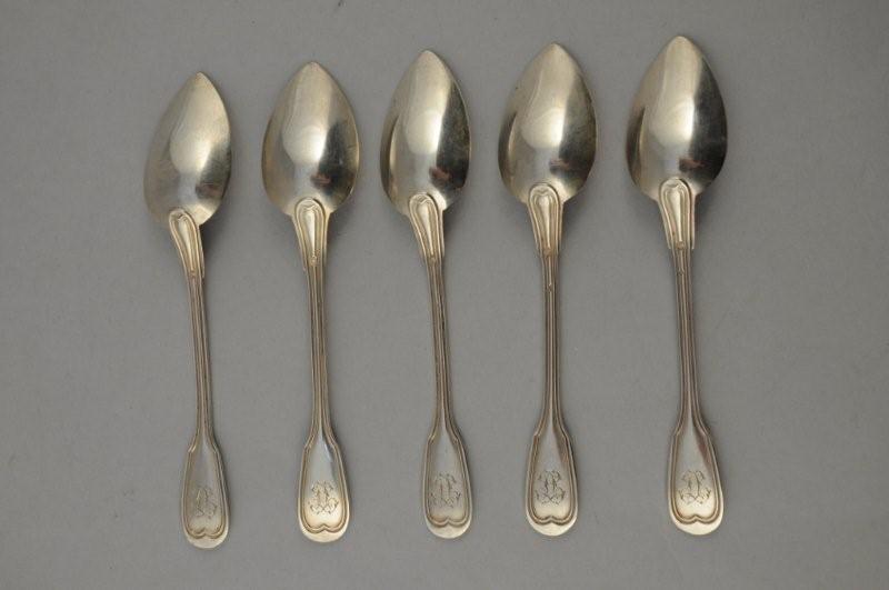 Suite de cinq CUILLÈRES à CAFÉ en argent, modèle à filets, à spatule monogrammée. Poinçon Minerve. XIXème. Poids : 100 g.