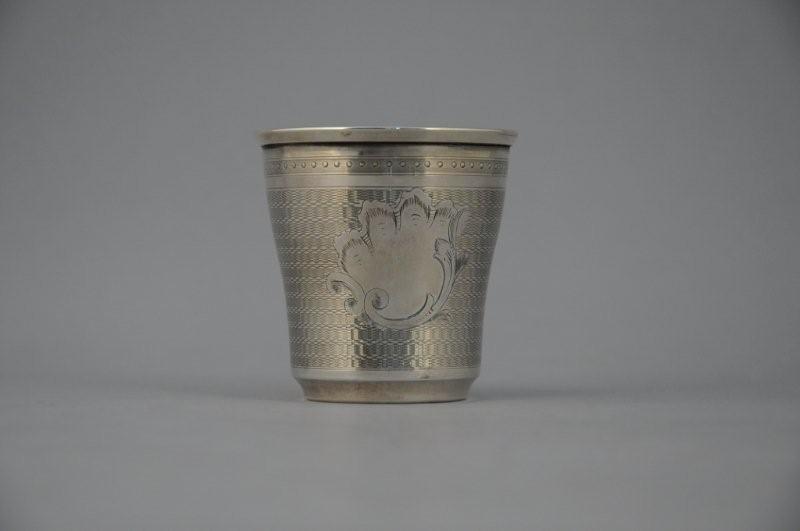 TIMBALE à corps mouvementé à fond plat à décor gravé d'un cartouche rocaille, non monogrammé, sur fond guilloché, rang de perles en bordure. Poinçon Minerve.