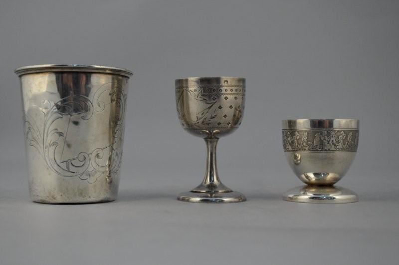 Joint : COQUETIER en métal argenté à frise gravée d'enfants et de moulins.