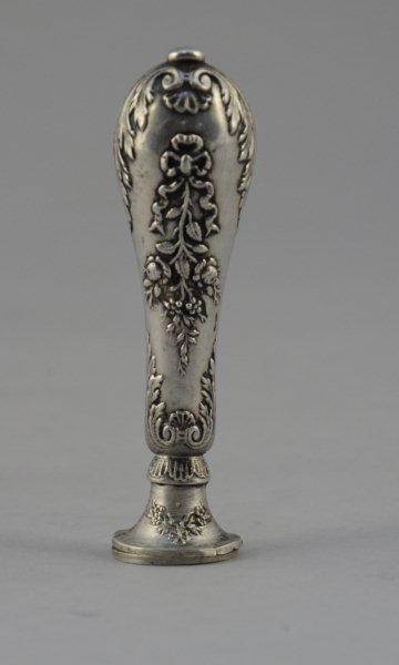CACHET en argent fourré piriforme à décor en repoussé de fleurs nouées d'un ruban en chute, et de feuilles d'acanthe. Monogrammé "J.B.". Haut. 8 cm, Poids brut : 25 g