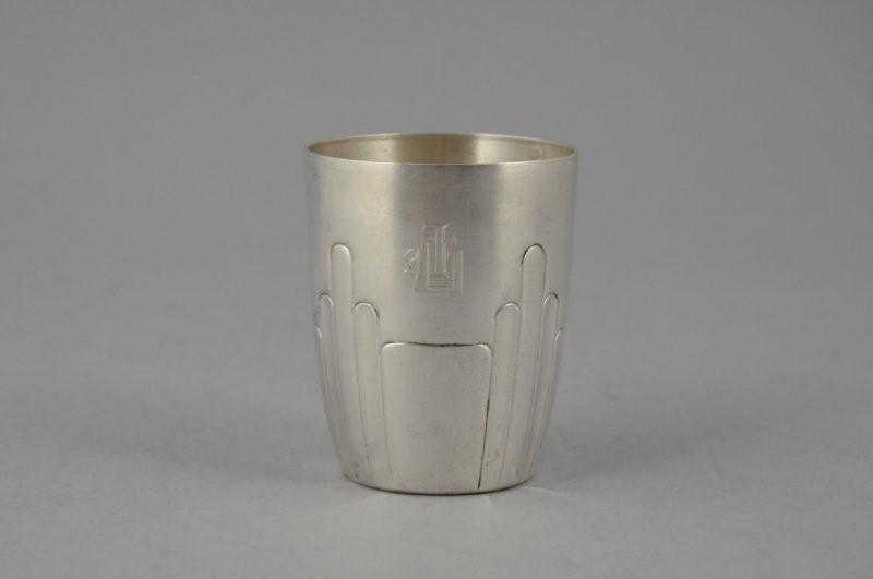 TIMBALE légèrement évasée en argent à décor en repoussé de cannelures, monogrammée "J.G.". Poinçon Minerve. Art Déco. Haut. 7,5 cm, Poids : 90 g.