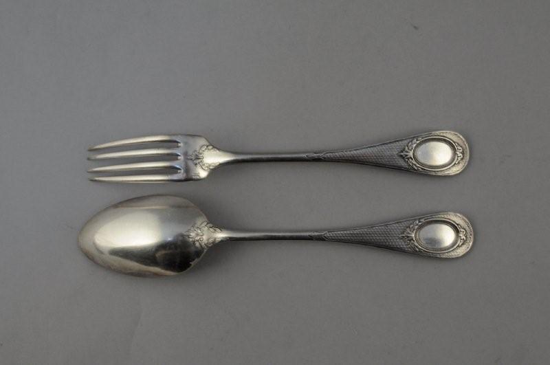 COUVERT en argent, modèle de forme baguette ou Vieux Paris, à décor guilloché, la tige ornée d'un médaillon feuillagé (non monogrammé). Poinçon Minerve. Fin XIXème. Poids : 160 g.