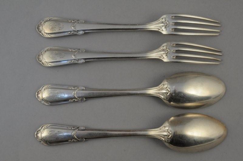 Suite de DEUX COUVERTS en argent, la tige à nervure et la spatule ornée de guirlande de lauriers nouée de rubans et de feuilles d'acanthe. Monogrammés "A.L". Style Louis XVI. Poinçon Minerve. Poids : 285 g (usures)