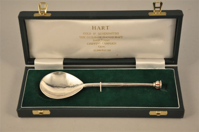 CUILLÈRE en argent. Le cuilleron martelé, la prise godronné. Travail anglais avec poinçons au Lion et "G of H" pour Guild of Handicraft, lettre date "a" pour 1956. Orfèvre : Georges Henri Hart. Dans son écrin marqué "HART gold and silversmiths The Guild of Handicraft Sheep Street Chipping Campden Clos". Long. 15 cm. Poids : 40 g.