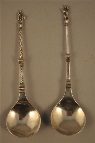DEUX CUILLÈRES en argent. L'une à tige torsadée, l'extrémité figurant des personnages en ronde bosse. Travail étranger. Poids : 120 g.