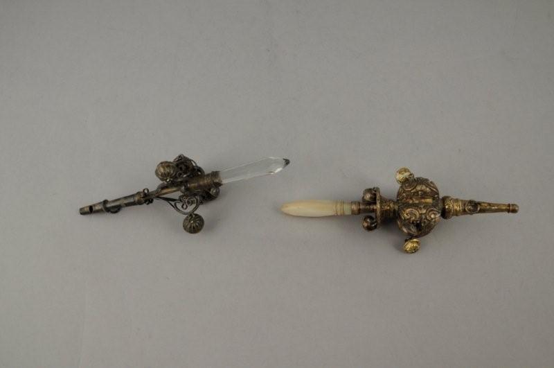Le premier à décor en repoussé de volutes, manche en nacre. XIXème. Haut. 16 cm. (restauration, manque deux grelots)