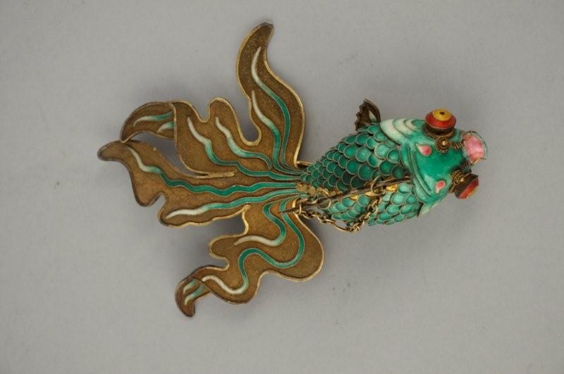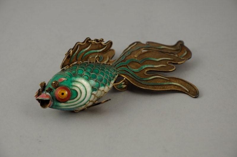 POISSON japonais en argent doré partiellement émaillé en polychromie. Le corps articulé, les nageoires en résille. Chaînette de suspension.