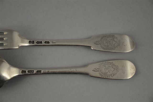 CUILLÈRE et FOURCHETTE en argent, modèle uniplat, la spatule gravée "P.S." dans un médaillon orné de perles et guirlandes de lauriers, surmonté d'un motif au caducée.