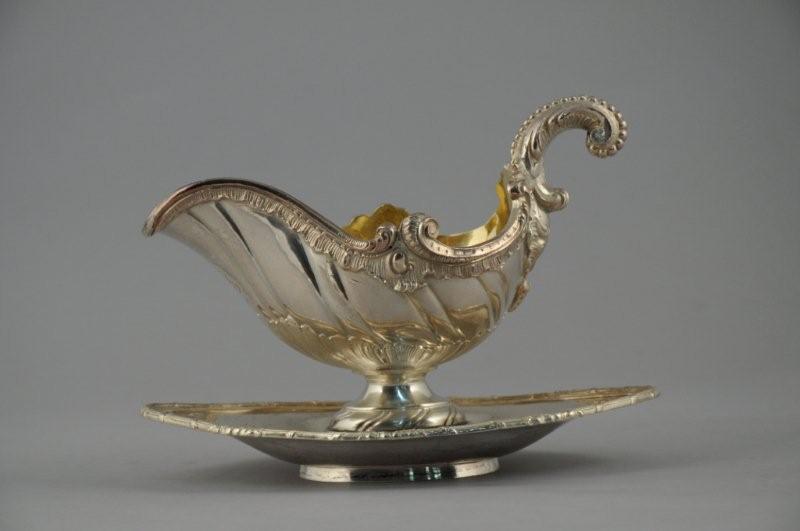 SAUCIERE sur son PLATEAU en argent de style XVIIIème. Réceptacle en forme de coquillage-casque au riche répertoire décoratif. Prise recourbée, intérieur vermeil. Armoirie double surmontée d'une couronne comtale. Poinçons étrangers Allemagne - Autriche ? et cygne. Long. 24, Haut. 17 cm. Poids 779 gr.