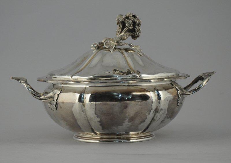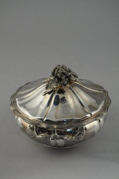 LEGUMIER couvert en argent, de style Louis XV, au fretel en choux. Receptacle uni argent. Anses feuillagées. Armoiries à couronne de marquis sur le couvercle. Poinçon Minerve. Maître Orfèvre M. Gauthier 39, rue Beaubourg Paris. Diam. 29, Haut. 18 cm. Poids total 1.856 gr.
