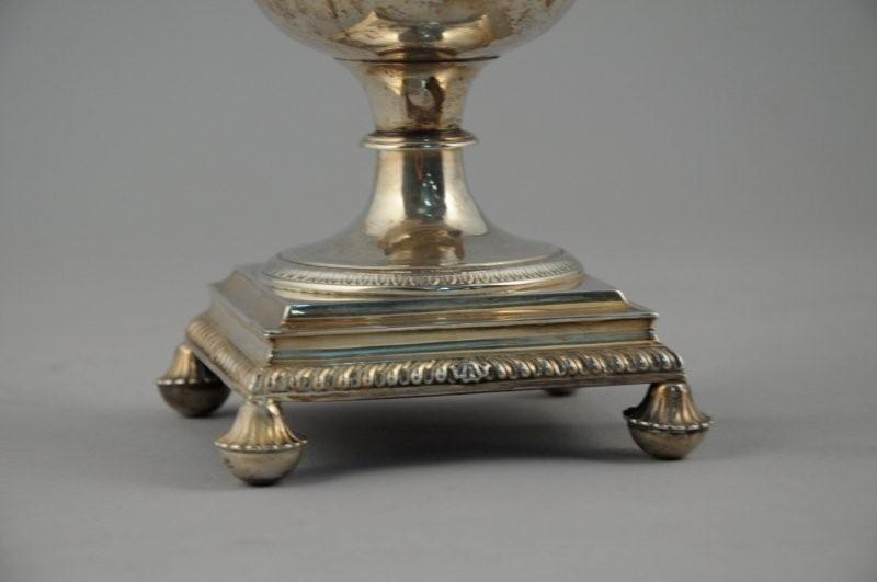 Riche DRAGEOIR couvert en argent et cristal. Base carrée reposant sur 4 pieds-boule, piédouche ornée de feuilles d'eau, palmettes, flots. Le corps est ajouré de palmettes stylisées à fleur de lotus en alternance avec des chapiteaux feuillagés d'acanthes stylisées. Anses et prise du couvercle d'entrelacs, de fleurs de lotus, et feuillages. Initiales. Réceptacle cristal taillé en lancettes. Charles X. Poinçon Michel Ange 1818-1838. Maître Orfèvre Etienne-Auguste COURTOIS, 62 rue du Temple, Paris, en service de 1834 à 1847, "spécialité de ce fabricant : la partie de la table" (Beuque, dictionnaire des poinçons, 1964, p. 272 ). Haut. 31 cm. Poids 633 gr.