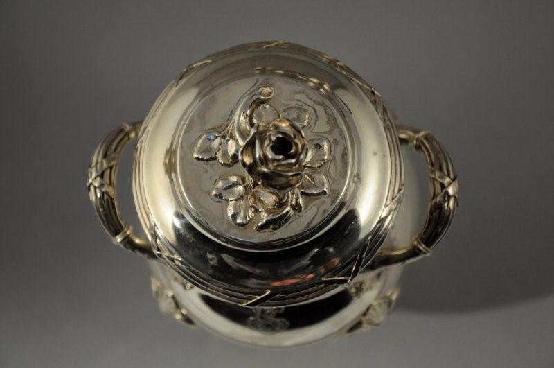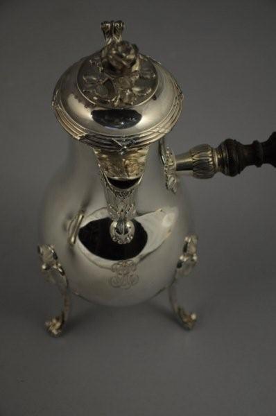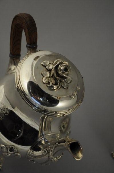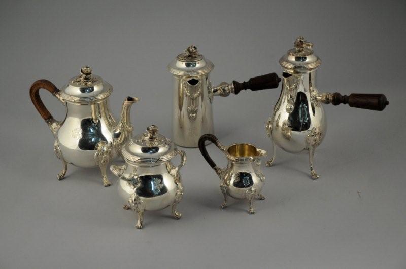 SERVICE THE-CAFE-CHOCOLATIERE 5 pièces dont sucrier couvert et crémier. Argent de style XVIIIème, au riche répertoire décoratif ornemental : tores de laurier, roses épanouies, feuillages stylisées d'acanthes, guirlandes. Initiales entrelacées. Manches bois tourné. Poinçon Minerve. Maître Orfèvre A. Riesler et Carré Paris. Haut. 20 cm. Poids total brut : 3.102 gr.