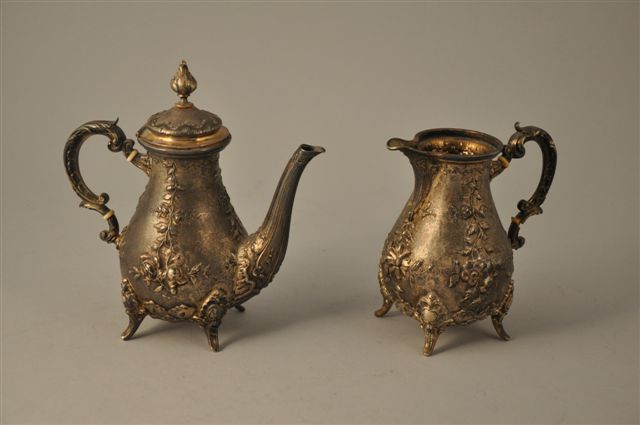Partie de SERVICE à CAFÉ en argent comprenant une cafetière et un pot à lait, reposant sur quatre pieds cambrés à attaches rocaille, corps amatis à décor en repoussé de guirlandes de roses et de marguerites en chutes, vagues stylisées au col, prise du couvercle en bouton feuillagé pointu, anse mouvementée feuillagée.