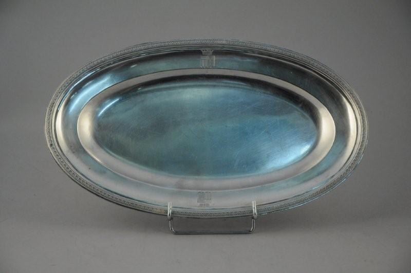 PLAT ovale en argent. Bordure à rangs de perles et frise de palmettes. Aile gravée à deux reprises d'armoiries d'alliance sommées d'une couronne ducale. Poinçon Minerve.