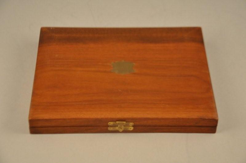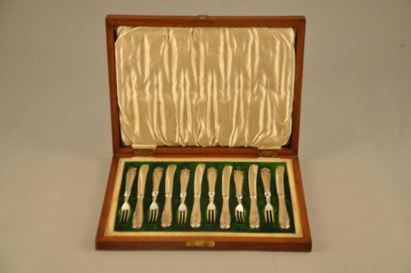 Suite de SIX COUTEAUX et de SIX FOURCHETTES à dessert, manches en argent fourré à feuillages et noeuds de ruban. Dans un coffret placage de palissandre à écusson.