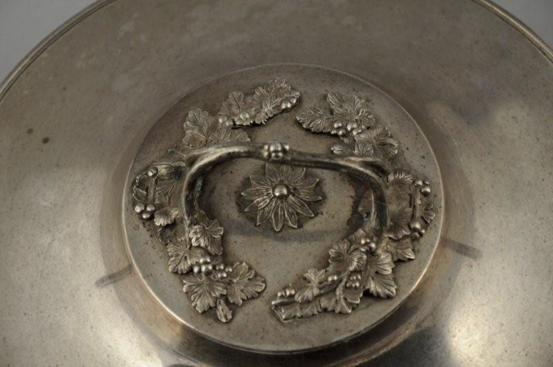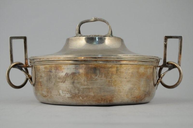 LEGUMIER couvert en argent uni, couvercle à prise en ronde de pampres. Anses latérales géométrisées terminées par des feuilles d'eau, avec anneaux.