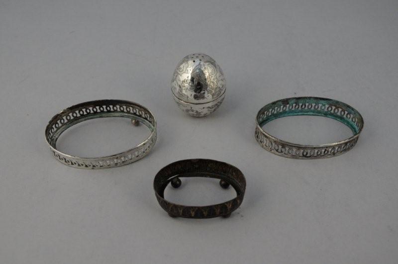 LOT en argent comprenant une SALIÈRE "Oeuf" gravé de motifs stylisés, deux MONTURES ovales en argent 800/1000ème ajouré de motifs circulaires (manque sept pieds boule), travail étranger. MONTURE de SALERON ovale en argent, quatre pieds boule, frise de larges feuilles d'eau, poinçon Minerve. Poids de la salière : 55 g. Poids total des montures : 44 g.