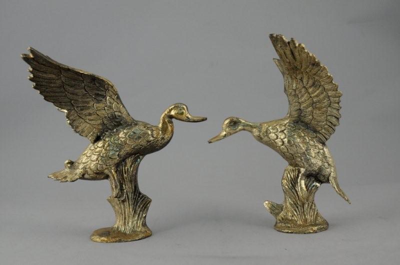 DEUX SUJETS "canard" prenant leur envol en métal argenté.