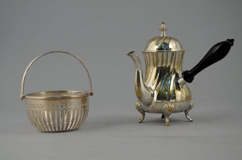 LOT en métal argenté comprenant un PANIER à corps ajouré verticalement, la bordure et l'anse mobile ornées de filets et rubans croisés (Haut. 5,5, Diam. 10,5 cm). CAFETIERE quadripode, le corps mouvementé à côtes torses, manche latéral. Haut. 18 cm (usures)