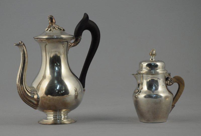 Deux VERSEUSES en métal argenté. La première unie sur piédouche, bec verseur à côtes pincées, couvercle godronné en bordure à prise en graine éclatée, anse mouvementée en bois noirci, CHRISTOFLE (Haut. 19 cm). La seconde égoïste à fond plat, le couvercle à filets et rubans croisés (chocs, anse en bois rapportée)