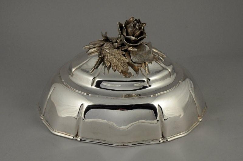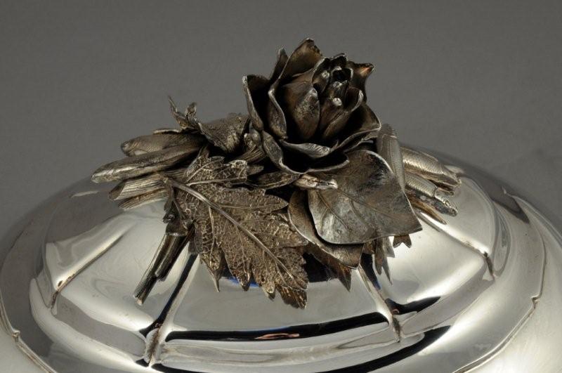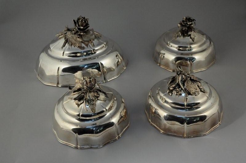 RARE SUITE de QUATRE CLOCHES à PLATS : 3 rondes, 1 ovale en métal argenté, à larges côtes et doucine. Exceptionnels frétels traités en naturel : artichaut/poissons - radis/feuilles de céleris - pivoines - et artichaut/haricots. Ecusson d'une nef à l'une avec initiales. Travail de qualité de Charles CHRISTOFLE. Milieu XIXème siècle.