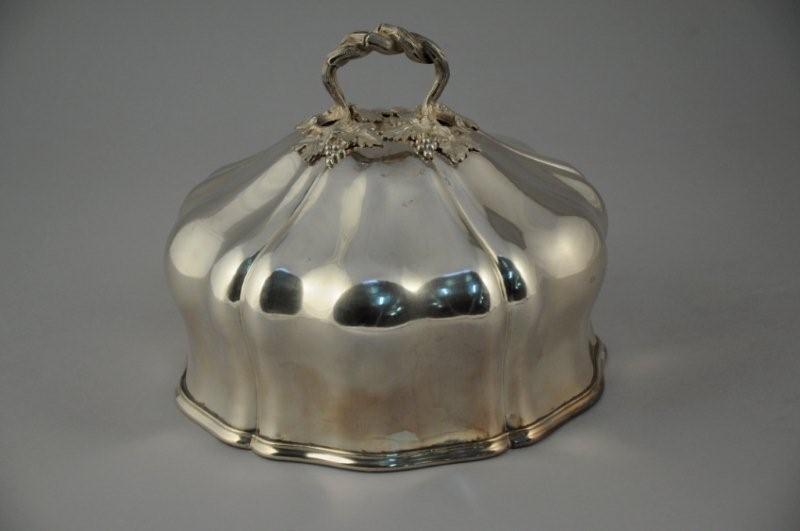 CLOCHE à PLAT ronde en métal argenté, à larges côtes galbées. Prise de main en argent, à décor de pampres et ceps de vigne. Initiales entrelacée. Fin XIXème. Poids de l'argent : 215 gr. Haut. 21, diam. 24 cm.
