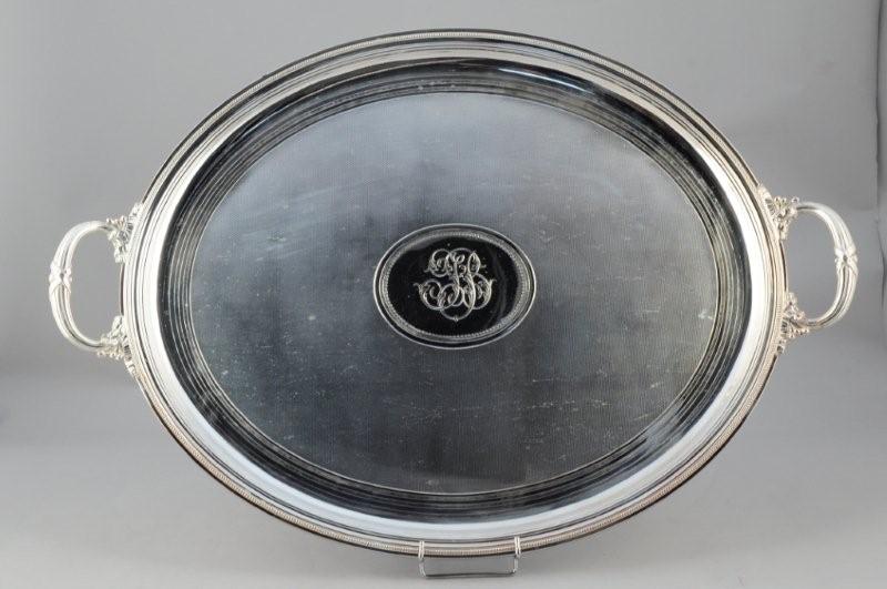 Grand PLATEAU ovale en métal argenté. Bordure à rang de perles, anses à rubans croisés et noeuds de rubans. Fond guilloché monogrammé au centre "IB". Marqué CHRISTOFLE.