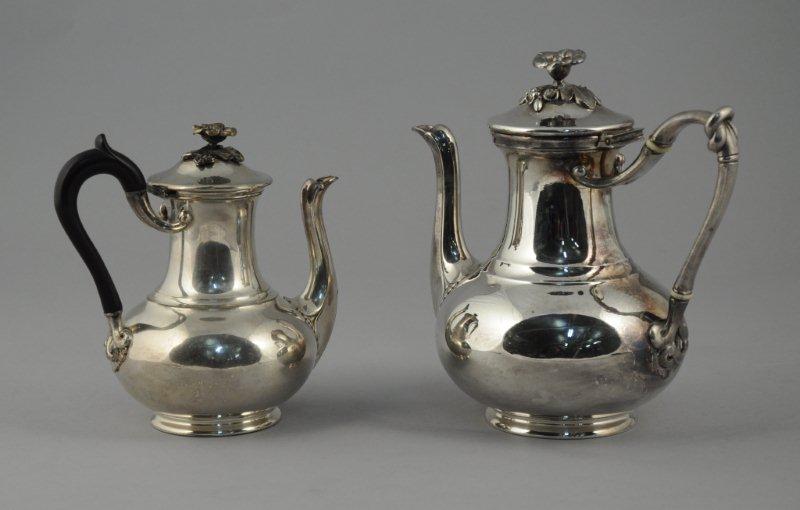 PARTIE de SERVICE à THÉ en métal argenté comprenant deux VERSEUSES sur léger piédouche. Anse amatie à entrelacs pour l'une et en bois noirci pour l'autre. Prise des couvercle en volubilis. CHRISTOFLE. Haut. 17,5 et 22 cm.