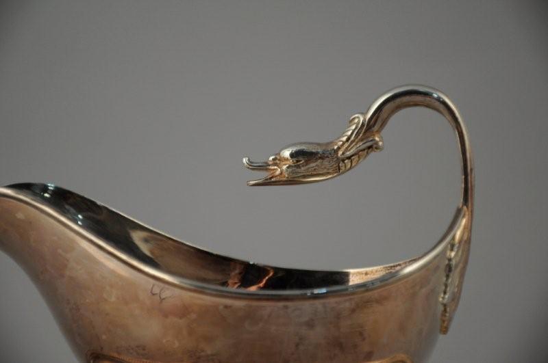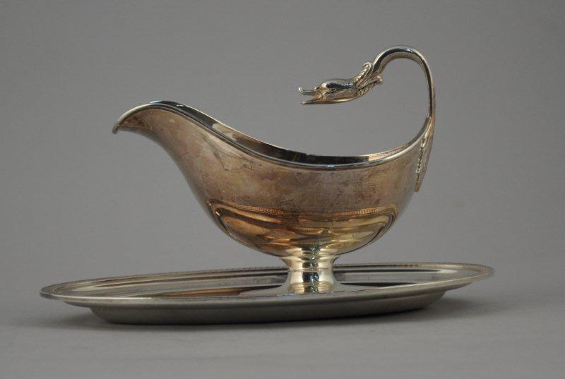 SAUCIÈRE de forme "casque" et son dormant ovale en métal argenté, ornés à la base et en bordure d'une frise de feuille d'eau, la saucière à col de cygne. Style Empire. Haut. 14, Long. 24 cm