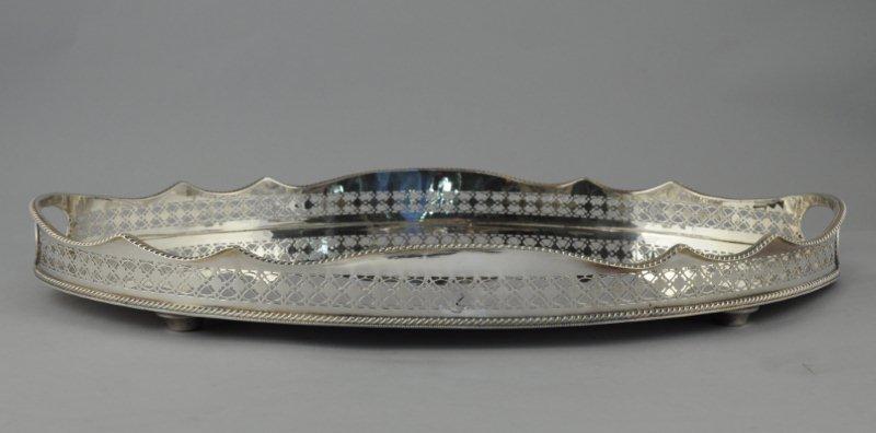 PLATEAU en métal argenté reposant sur quatre pieds. Galerie ajourée de motifs circulaires et de croisillons entrelacés, à bordure mouvementée. Décor godronné et à rangs de perles. Angleterre. Haut. 6,5, Long. 61,5, Larg. 41 cm.
