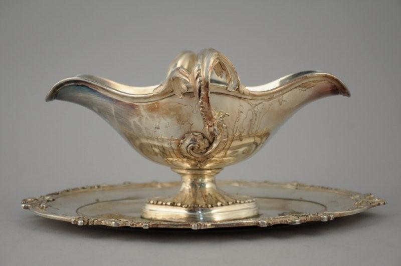 SAUCIÈRE et son dormant ovale en métal argenté. Riche bordure de volutes et contre-volutes feuillagées. Gravure aux armes sous couronne comtale. Pied orné de vagues stylisées, les anses en branche feuillagée asymétrique d'inspiration rocaille. CAILAR BAYARD. Style Louis XV. Haut. 14, Long. 24 cm
