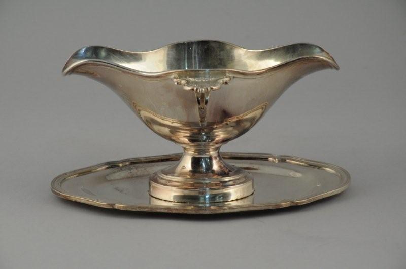 SAUCIÈRE et son dormant ovale en métal argenté. Modèle à filets contours. Anses latérales feuillagées à coquille stylisée. CHRISTOFLE. Style Régence. Haut. 12,5, Long. 27 cm.