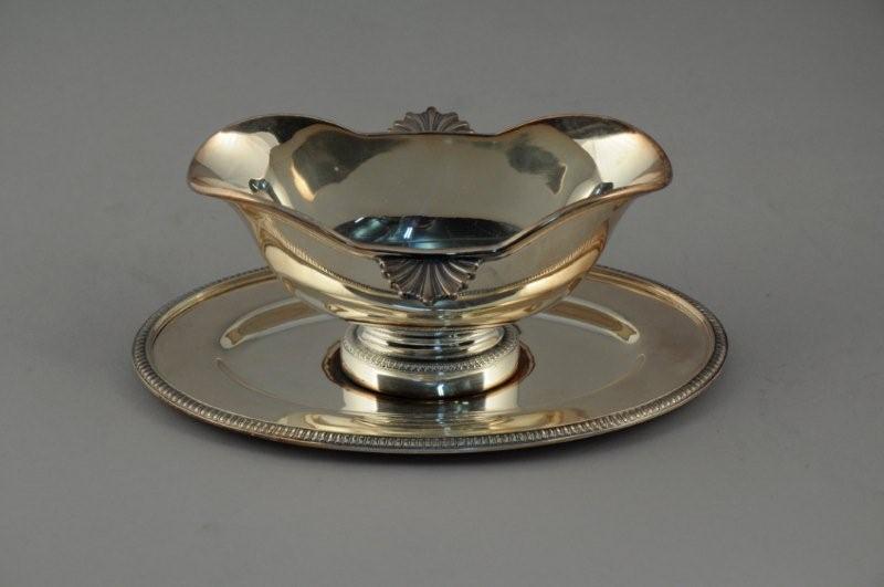 SAUCIÈRE et son dormant ovale en métal argenté uni. Bordure et pied ornés d'une frise de godrons. Anses latérales en palmette stylisée. Haut. 10, Long. 25 cm.
