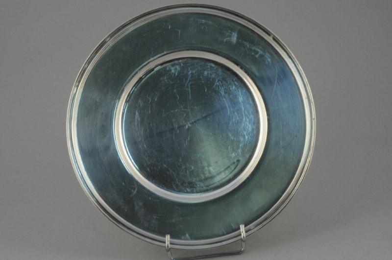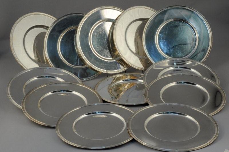 Suite de DOUZE ASSIETTES en métal argenté uni. L'aile ornée de filets en bordure. CHRISTOFLE. Diam. 30 cm.