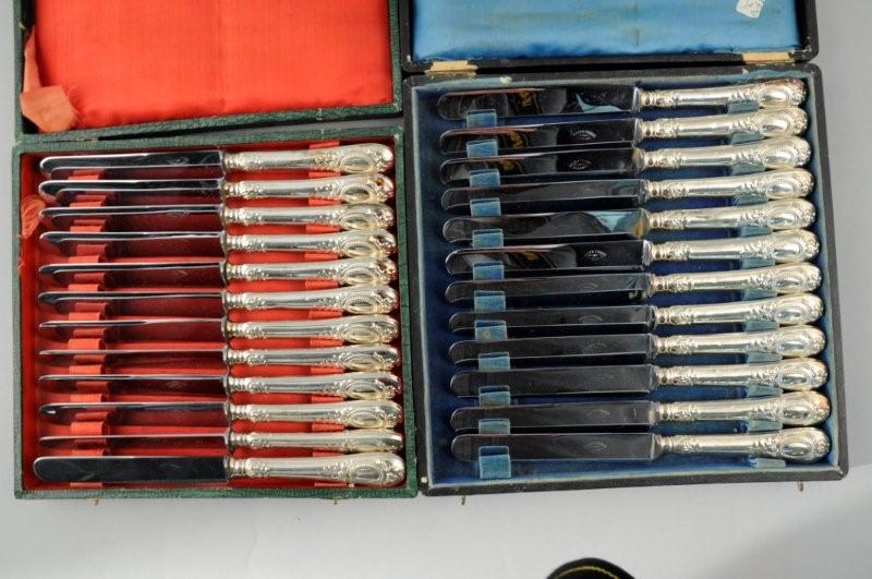 VINGT-QUATRE COUTEAUX de table, manche argenté, de stryle XVIIIème. Lame acier. XIXème. Dans deux écrins. Bon état.