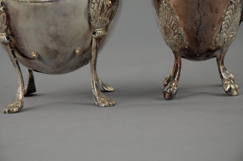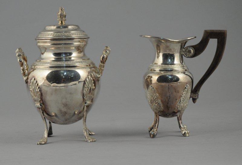 SUCRIER et POT à LAIT en métal argenté. Reposent sur quatre pieds terminés en griffe, les attaches en palmettes stylisées. Les bordures ornées de frise de feuilles d'eau. Prise du couvercle en bouton. Anse du pot à lait en bois. SAINT-REMI pour le pot à lait. Style Restauration. Haut. respectives : 19,5 et 15 cm