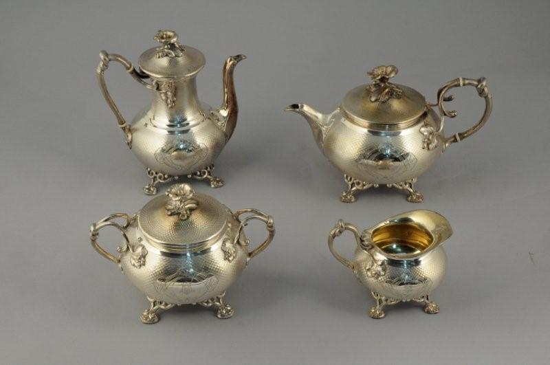 SERVICE à THÉ et CAFÉ 4 pièces en métal argenté comprenant une cafetière, une théière, un sucrier et un pot à lait, de forme pansue reposant sur quatre pieds en patins ornés d'entrelacs. Fonds entièrement guilloché, anses en volutes à entrelacs feuillagées aux attaches, prise des couvercles en fleur de volubilis. Monogrammé "M.A." dans un cartouche. CHRISTOFLE. Napoléon III. Seconde moitié du XIXème.