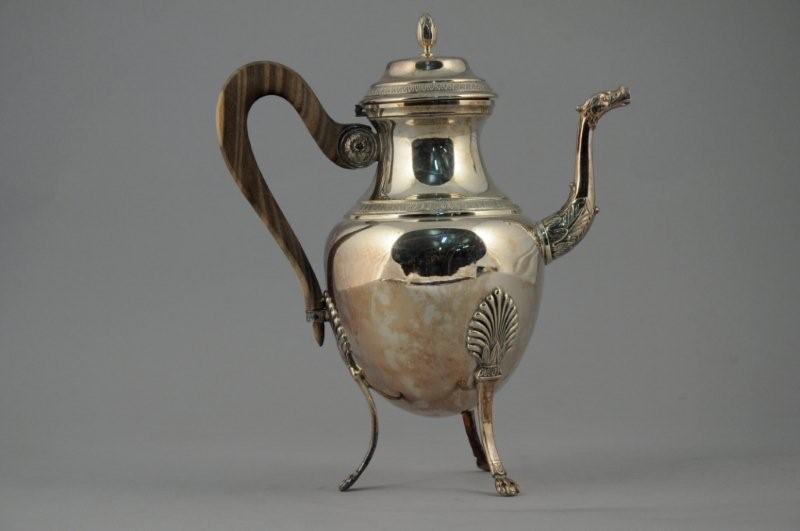 CAFETIÈRE en métal argenté à corps ovoïde. Elle repose sur trois pieds terminés en griffes, les attaches en palmette. Bec verseur zoomorphe feuillagé à la base. Frises de feuilles d'eau. Prise du couvercle en bouton. Anse mouvementée en bois naturel. Style Restauration. Haut. 27 cm.