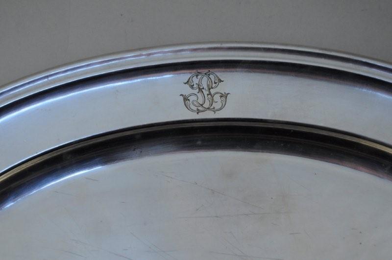 PLAT ovale en métal argenté uni, bordure à profil mouluré, l'aile gravé du monogramme "IL" ou "PL". CHRISTOFLE. Long. 46, Larg. 29,5 cm.