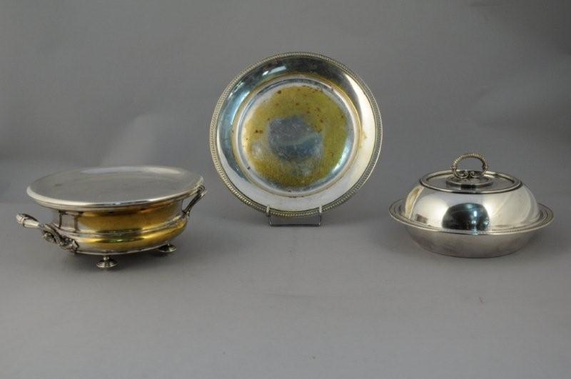 LOT comprenant un CHAUFFE-PLAT en métal argenté reposant sur quatre pieds en toupie, anses latérales mouvementées feuillagées. CHRISTOFLE. XIXème (usures).