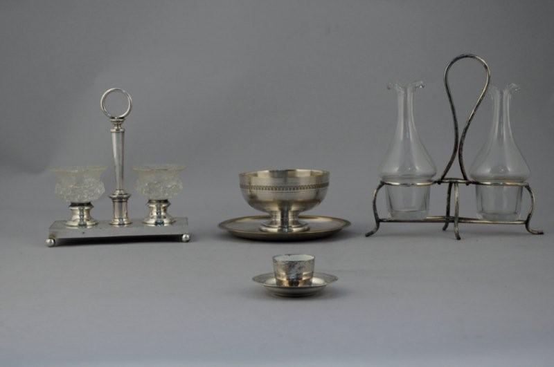 HUILIER-VINAIGRIER à monture en métal argenté en fil de section ronde, les burettes en verre. BOL sur pied et son DORMANT circulaire en métal argenté, ornés en bordure d'une frise de feuilles d'eau (usures). SOUS-TASSE en métal argenté et gobelet en métal.