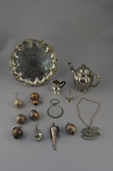 LOT comprenant : PLATEAU rond en métal argenté, la bordure polylobée agrémentée de volutes et de roses, le fond à décor feuillagé et cartouches à fond de croisillons. Diam. 32 cm (usures). POT à LAIT en métal argenté à rang de perles, filets et rubans croisés, anse en bois noirci. Style Louis XVI. VERSEUSE en métal à côtes melon, anse simulant une branche et prise du couvercle en fleur. Ensemble de HUIT FRUITS décoratifs stylisés, à suspendre, en métal argenté dont grenade, orange, callebasse. CLOCHETTE de table en métal , la prise en grappe de raisins. MOTIF aux deux perroquets en métal, chaîne à maillons cordiformes. MIROIR circulaire à poser, à monture argentée (Diam. 9,5 cm)