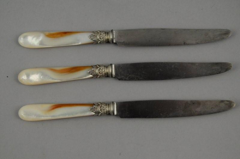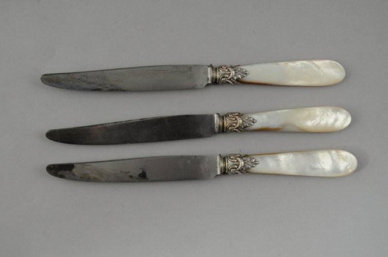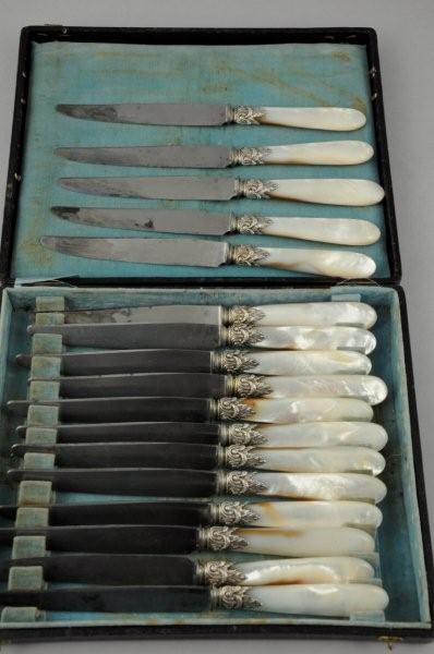 SERVICE de COUTEAUX comprenant une suite de 17 grands COUTEAUX et 18 COUTEAUX à DESSERT, la lame en acier, le manche en nacre, la virole argentée décor de guirlandes de lauriers et feuille d'acanthe. Dans deux écrins.