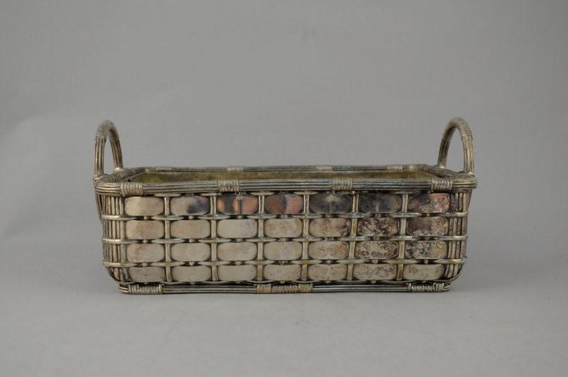 JARDINIÈRE rectangulaire en métal argenté en tressage "vannerie". Anses circulaires latérales. Avec sa doublure. Dim. hors tout : Haut. 15, Long. 33,5, Larg. 22 cm.