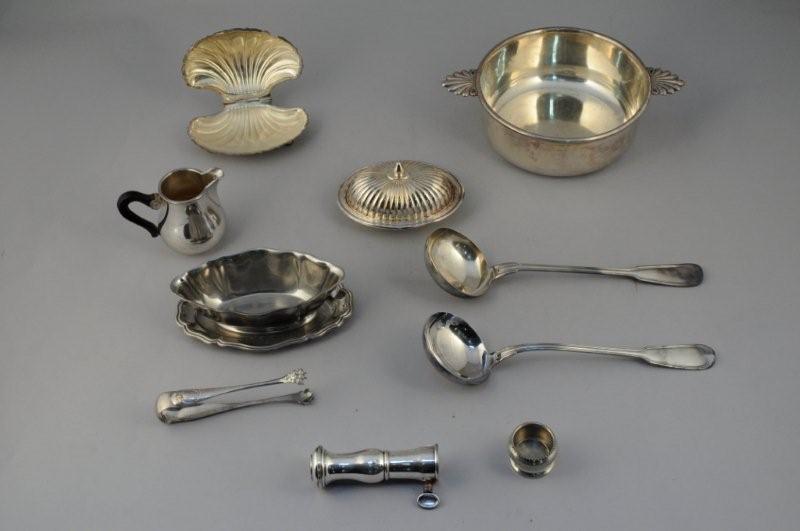 LOT en métal argenté comprenant : JATTE ronde, anses latérales en palmettes (Diam. 21,5 cm). DEUX LOUCHES, modèle à filet. Un MANCHE à GIGOT. DEUX BEURRIERS, lun ovale à couvercle godronné, l'autre "coquille", couvercle à charnière, avec son intérieur en verre dépoli. POT à LAIT à fond plat, anse en bois noirci. PINCE à SUCRE à griffes de lion. (usures)