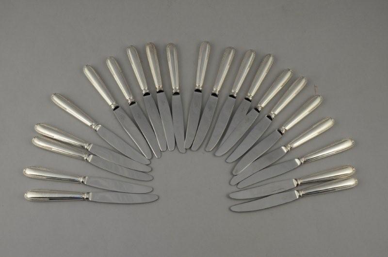Ensemble de 31 COUTEAUX à manches en métal argenté, à décor perlé, lames inox, comprenant une suite de DIX GRANDS COUTEAUX et une suite de VINGT-ET-UN COUTEAUX à dessert. RAVINET D'ENFERT à Paris. Style Louis XVI.