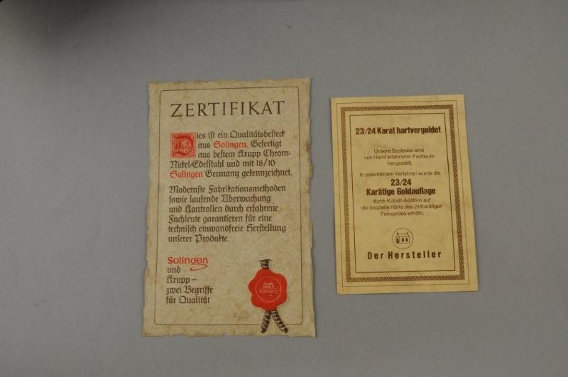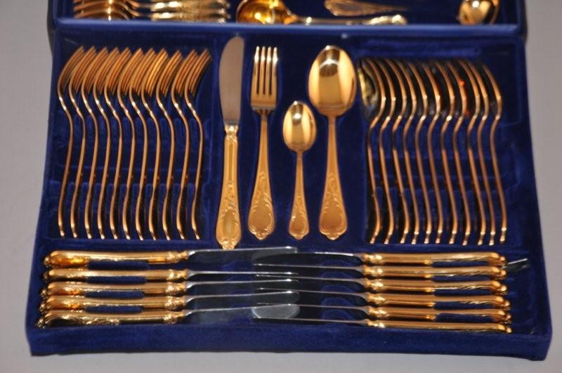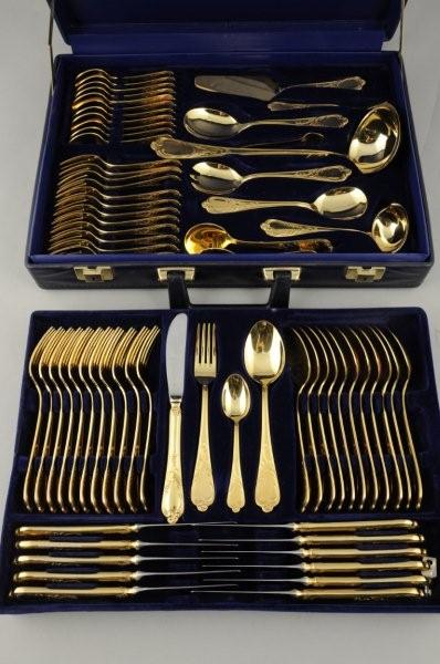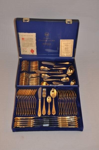 MÉNAGÈRE en métal doré 70 pièces comprenant 12 couverts, 12 couteaux lames inox, 12 cuillères à café, 12 fourchettes à gâteaux, et 10 pièces de service. Maison SOLINGEN. Dans une valise bleue (état neuf)